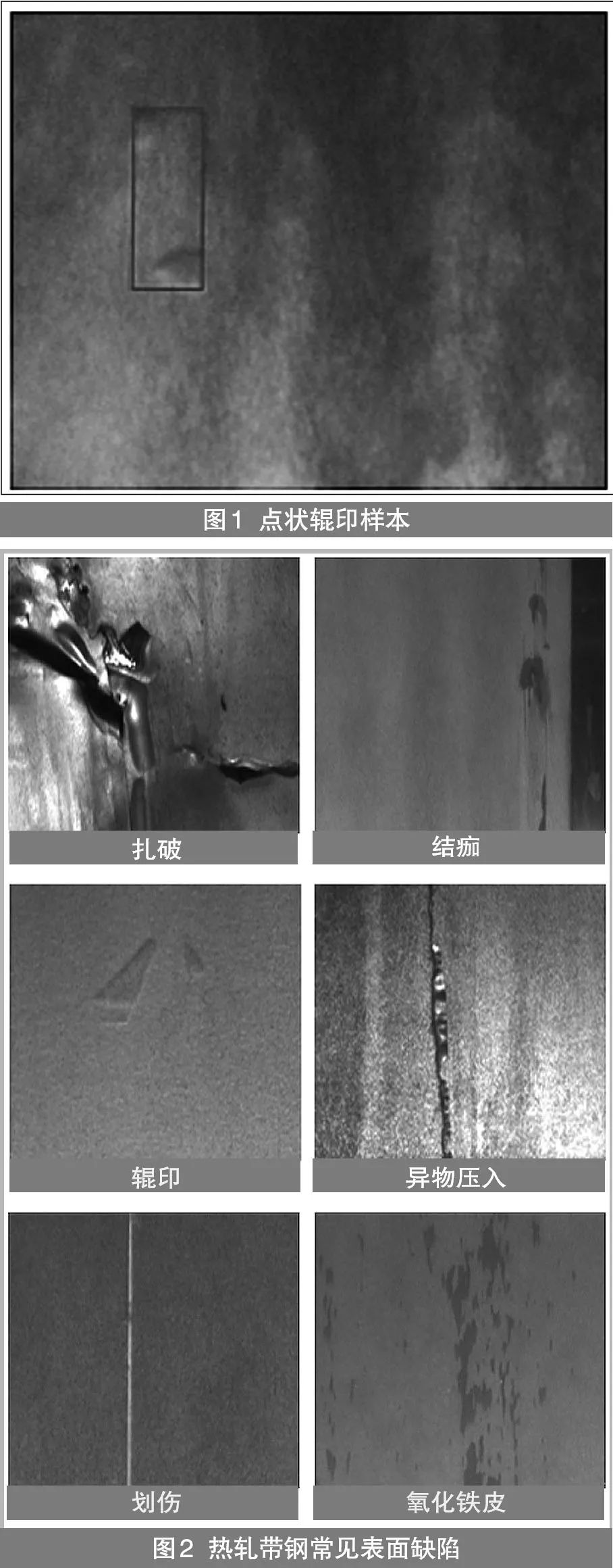 三是作為樣本的缺陷圖片,應保證感興趣區域選定的缺陷只有一種,且被選定的缺陷恰好被圖框覆蓋,圖框范圍過大、過小都不合適,而且缺陷應清晰,圖片背景紋理應均勻,表面明暗程度應均勻,而現有檢測系統的樣本缺陷圖片有待改進。例如,圖1是點狀輥印的樣本圖片,圖片存在兩個問題:第一,感興趣區中的缺陷有兩個;第二,圖片表面明暗程度差異過大,這樣造成誤判的可能性較大。
