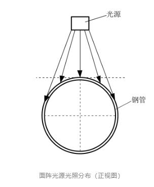 平面材料表面缺陷檢測的光照分布示意圖對于鋼管而言,因其幾何結構特點,當采用面陣光源時,弧形外表面使得光源中心與被照射區域各處之間距離相差過大,如圖所示,與光源最短距離位置處表現為較高亮度,而在最短距離位置兩測,光照亮度分布減弱,圖像成像結果也表現類似特點,中間區域像素灰度分布較高而兩側區域像素灰度值較小。