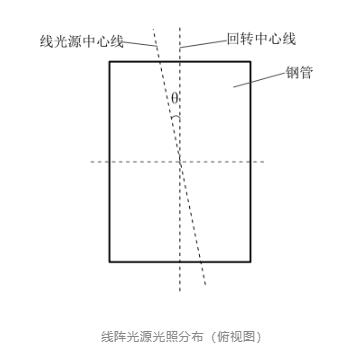 面陣光源光照分布(正視圖)另一情況如圖所示,采用線陣相機和線陣光源實現鋼管表面缺陷動態檢測時,因振動、裝配誤差等因素,線陣光源中心線與線陣相機視野長度方向并非位于同一直線,相機視野方向通常與鋼管回轉中心所在直線一致;這種情況會降低照射區域與視野區域重合性,導致成像結果光照不均現象嚴重,進一步增加圖像處理的困難度。