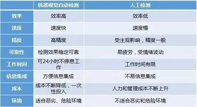 機器視覺優勢:機器視覺系統具有高效率、高度自動化的特點,可以實現很高的分辨率精度與速度。機器視覺系統與被檢測對象無接觸,安全可靠。人工檢測與機器視覺自動檢測的主要區別有: