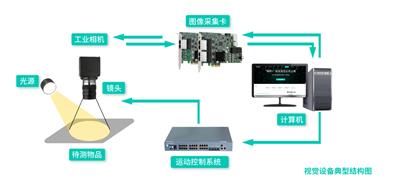一個(gè)典型的機(jī)器視覺檢測系統(tǒng)主要硬件組成為:光源、鏡頭、相機(jī)、 圖像處理單元、 監(jiān)視器、 通訊、輸入輸出單元等。基于以上需求分析,結(jié)合機(jī)器視覺檢測系統(tǒng)的具體特點(diǎn),設(shè)計(jì)金屬罐蓋缺陷檢測系統(tǒng)的硬件結(jié)構(gòu)如圖所示: