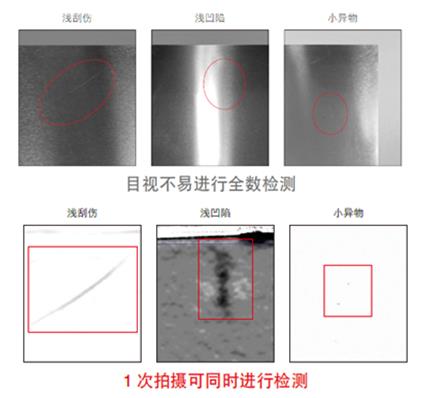 肉眼可以察覺的缺陷,圖像處理就是無法檢測。搭載全新算法的視覺檢測系統,讓依賴于目視檢測,因照射角度隱約可見的較淺劃傷、凹陷及細微的瑕疵缺陷無所遁形。