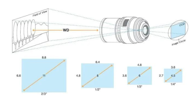 其次,確定所要達到的視野范圍(FOV)和工作距離(WD),然后根據(jù)這兩個要求和已知的靶面尺寸計算出工業(yè)鏡頭的焦距(f)。其計算公式為: