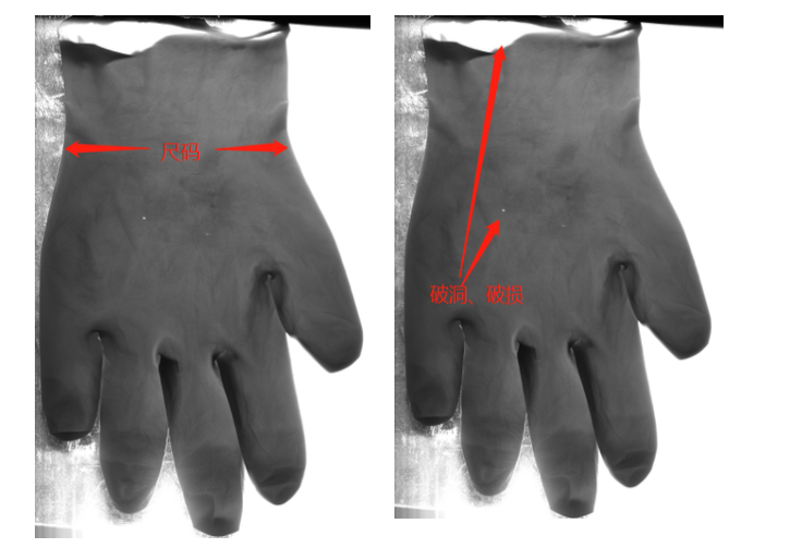 在手套的實際生產過程中,由于各方面因素的影響,手套表面會出現孔洞等瑕疵,嚴重影響了手套的質量,給生產商帶來了不必要的損失。人眼往往不能及時準確的判斷出瑕疵,而手套檢測系統能在線對生產過程中產生的表面缺陷瑕疵進行高速、精確的檢測,顯示和識別手套表面上的缺陷。
